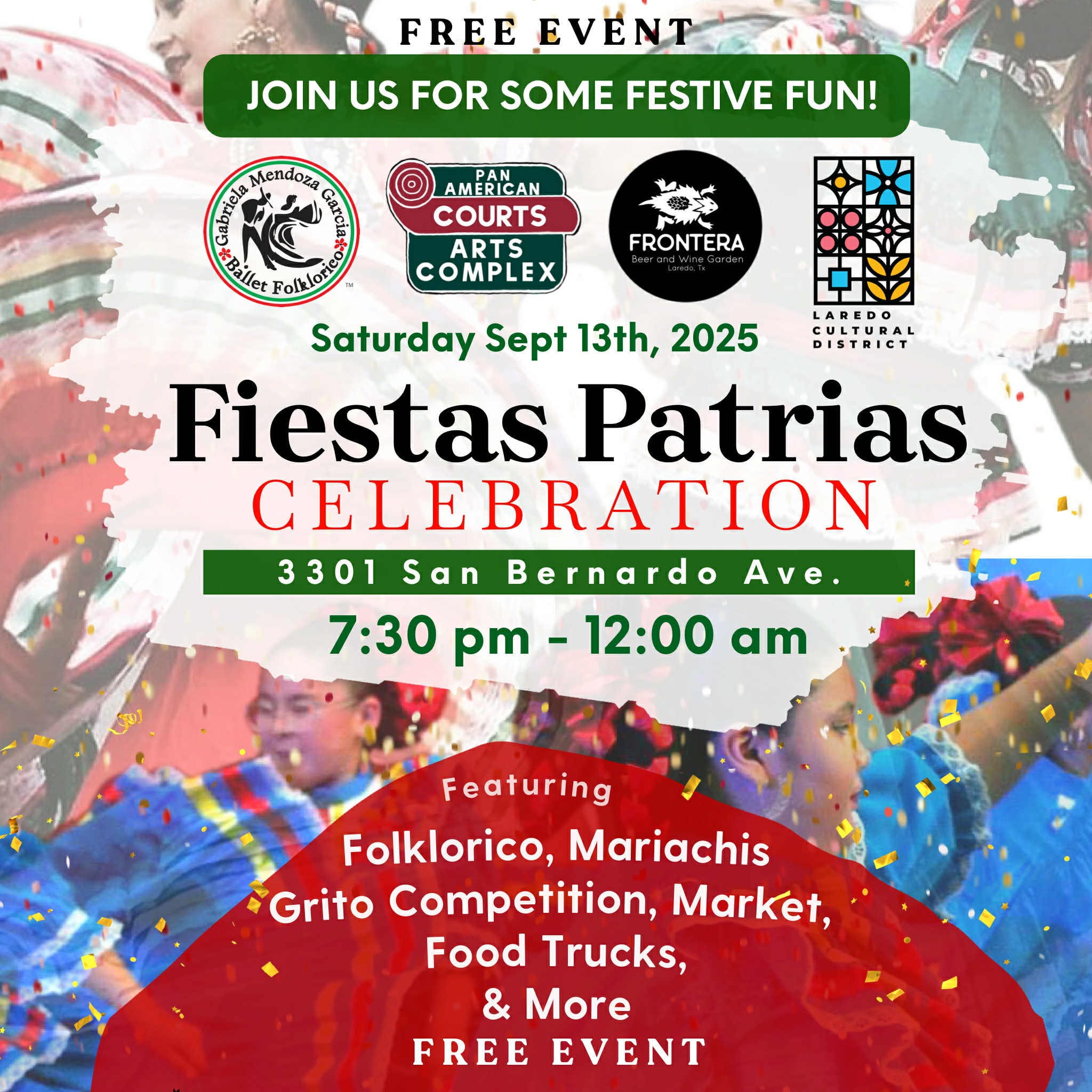 Avenida San Bernardo, el Distrito Cultural de Laredo y el Complejo de Artes de las Cortes Panamericanas patrocinan este evento que contará con actuaciones del Ballet Folklórico Gabriela Mendoza-García.